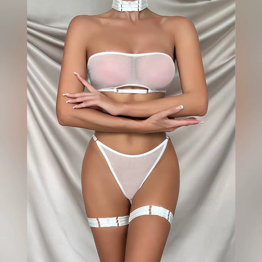 BLS Royal Blue Sheer Mesh 3-Piece Lingerie Set – Strapless Bra, Thong & Garter Accessories