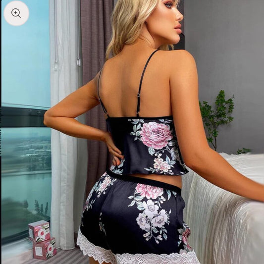 BLS Plus Size Satin Pajama Set – Black Camisole with Leopard Print Lounge Pants